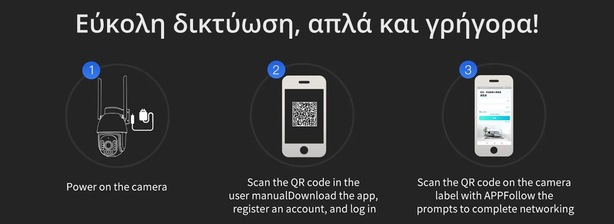 - Plug & Play με εύκολη σύνδεση στο δίκτυο μέσω QR-Code στην εφαρμογή της Vstarcam (O-KAM & EYE4) για κινητά/tablet iOS & Android