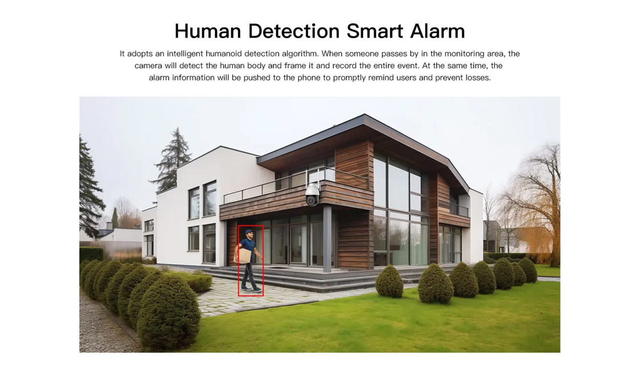 - Έξυπνη Ανίχνευση AI Human detection & Ειδοποιήσεις: Η κάμερα αντιλαμβάνεται την ανθρώπινη κίνηση και σας στέλνει άμεσες ειδοποιήσεις (push notifications) στο κινητό, αποφεύγοντας τους ψευδείς συναγερμούς από ζώα, δέντρα ή κινήσεις του αέρα. Σε περίπτωση εντοπισμού, στέλνει άμεση ειδοποίηση στο κινητό σας.