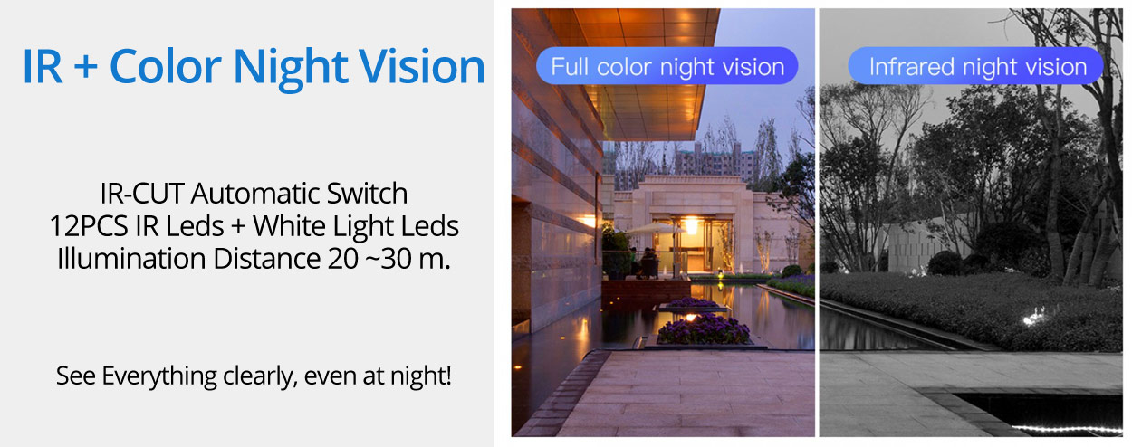 Από άποψη υπέρυθρου αλλά και ορατού φωτισμού, η CS665Q της Vstarcam διαθέτει 6 ισχυρά Υπέρυθρα LED, κατάλληλα για νυχτερινή υπέρυθρη παρακολούθηση σε αποστάσεις ως 20~30 μέτρα, αλλά και 6 Ισχυρά LED Ορατού Φωτός (ορατά στο ανθρώπινο μάτι, που φωτίζουν σαν μικρά προβολάκια) υψηλής έντασης, για Έγχρωμη Νυχτερινή Παρακολούθηση, τα οποία μπορείτε να επιλέγετε να τα ενεργοποιείτε χειροκίνητα όποτε εσείς θέλετε, με το πάτημα ενός πλήκτρου στην εφαρμογή O-KAM, ή να επιλέξετε να ενεργοποιούνται αυτόματα, είτε σταθερά αναμμένα για ένα σύντομο χρονικό διάστημα, είστε να αναβοσβήνουν, όταν η κάμερα ανιχνεύει κίνηση (Motion Detection).
