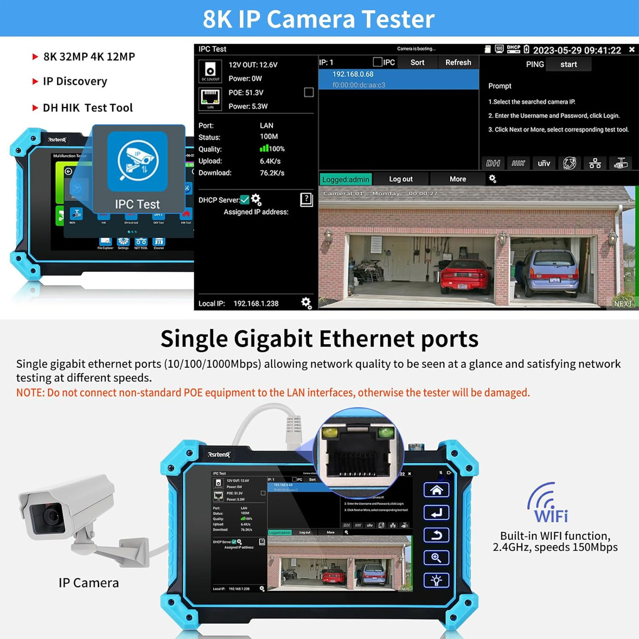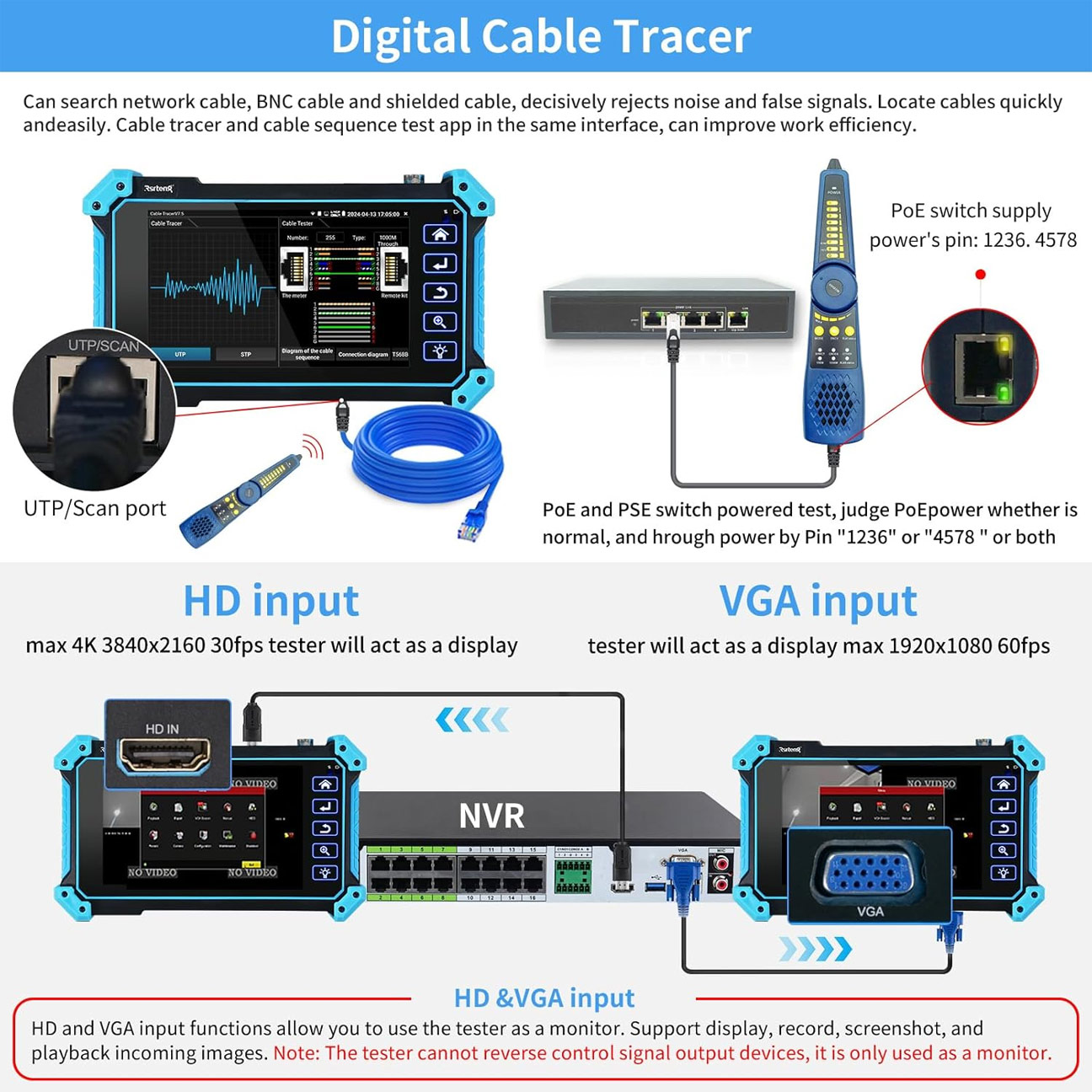 - Είσοδοι HDMI & VGA: Λειτουργεί και ως φορητό Monitor για την παραμετροποίηση DVR/NVR, υποστηρίζοντας HDMI έως 4K και VGA έως 1920x1200.