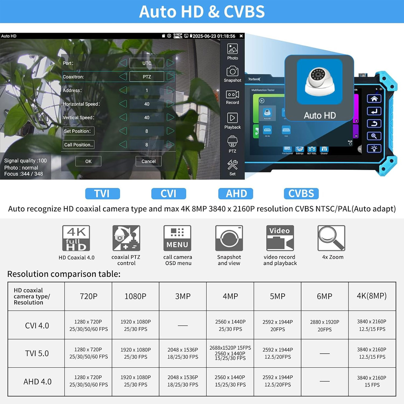 Επιτρέπει επίσης τον έλεγχο PTZ τόσο για αναλογικές και όσο και για IP κάμερες. Διαθέτει Wi-Fi ενσωματωμένο για ασύρματη προβολή εικόνας. Ιδανικό εργαλείο για τεχνικούς CCTV, εγκαταστάτες συστημάτων ασφαλείας και έργα δικτύων, καθώς συνδυάζει σε μία φορητή συσκευή όλες τις απαραίτητες λειτουργίες για δοκιμές, ρυθμίσεις και συντήρηση.