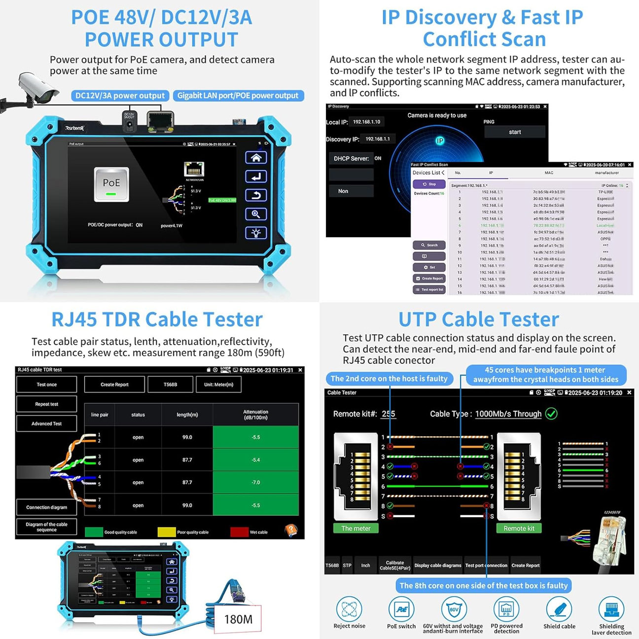 - RJ45 TDR Cable Test: Μετρήστε με ακρίβεια το μήκος του καλωδίου, την εξασθένηση και την εμπέδηση, και εντοπίστε το ακριβές σημείο σφάλματος έως τα 180 μέτρα.