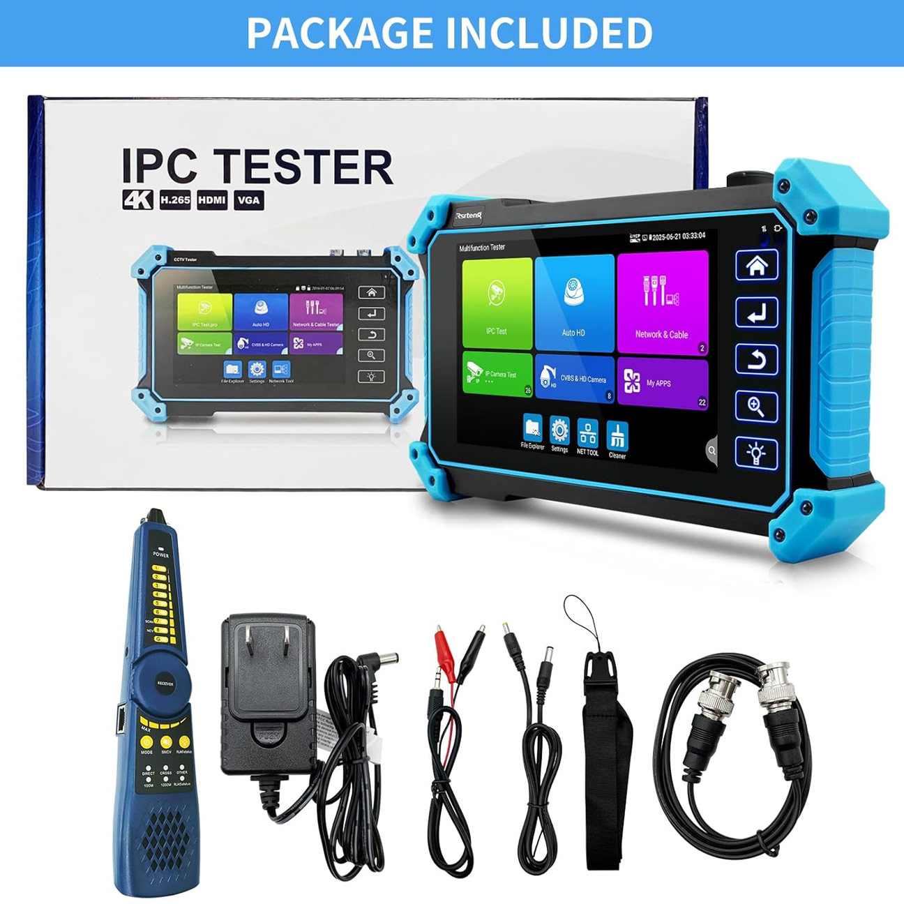 Το πλήρες πακέτο περιλαμβάνει: CCTV Tester X51C-PLUS, εξωτερικό ελεγκτή καλωδίων δικτύου, τροφοδοτικό 12V 1A, μπαταρία, επαγγελματική τσάντα μεταφοράς, πλήρες σετ καλωδίων σύνδεσης, ιμάντα καρπού και οδηγίες χρήσης.