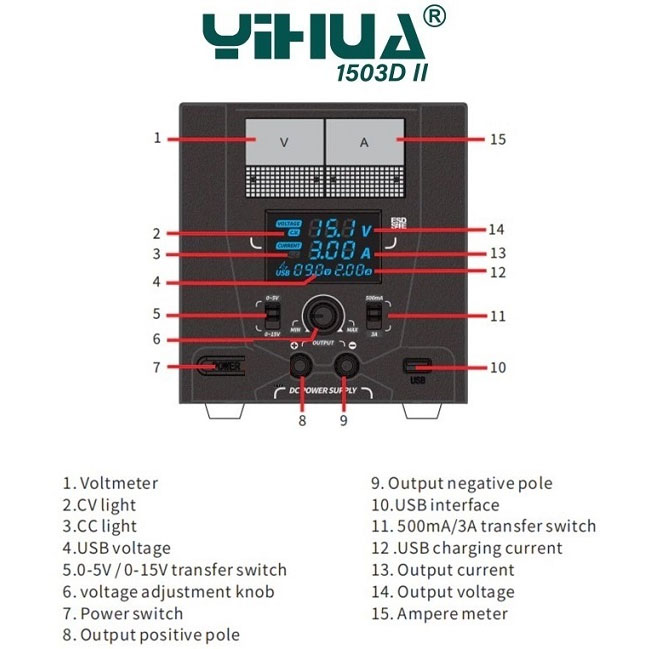 YIHUA-YH-1503D-II Εργαστηριακό τροφοδοτικό 1 Εξόδου 0-15V 0-3A με LCD Display και έξοδο USB με πρωτοκολλά γρήγορης φόρτισης QC2.0, QC3.0 για ταχεία φόρτιση των συσκευών σας. Είναι μικρό σε μέγεθος και ελαφρύ, πολύ βολικό στη μεταφορά,εχει σταθερότητα υψηλής τάσης, μικρό συντελεστή κυματισμού. Διαθέτει προστασία από βραχυκύκλωμα, υπερθέρμανση, υπέρταση, υπερφόρτωση και υπερβολικό ρεύμα.