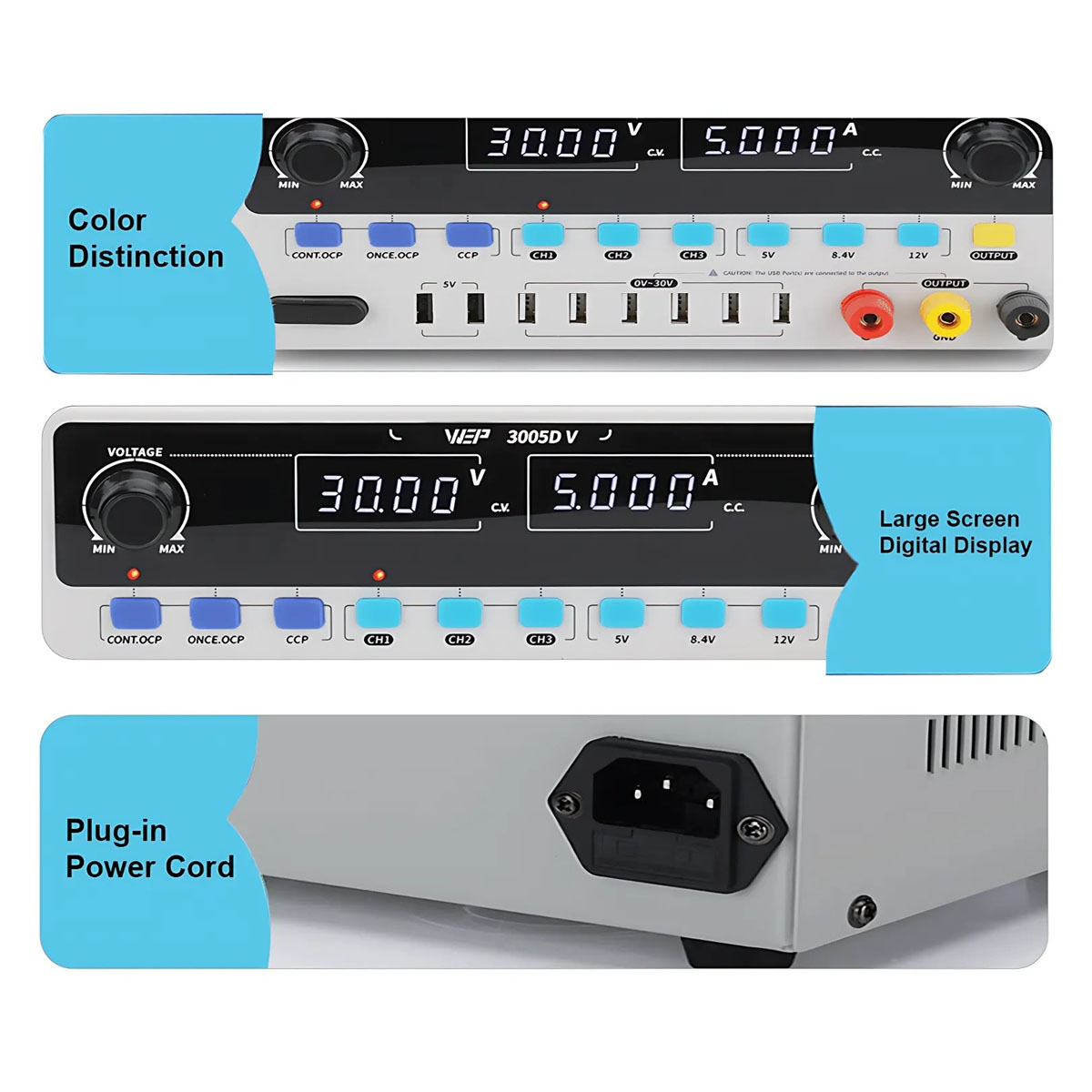 Επιπλέον, το τροφοδοτικό παρέχει δύο θύρες USB 5V και έξι θύρες USB σε παράλληλη σύνδεση με την έξοδο 30V, προσφέροντας αυξημένη ευελιξία στη σύνδεση πολλαπλών συσκευών, με τη σύσταση τα φορτία να συνδέονται πάντα στη σωστή ονομαστική τάση για αποφυγή ζημιών.