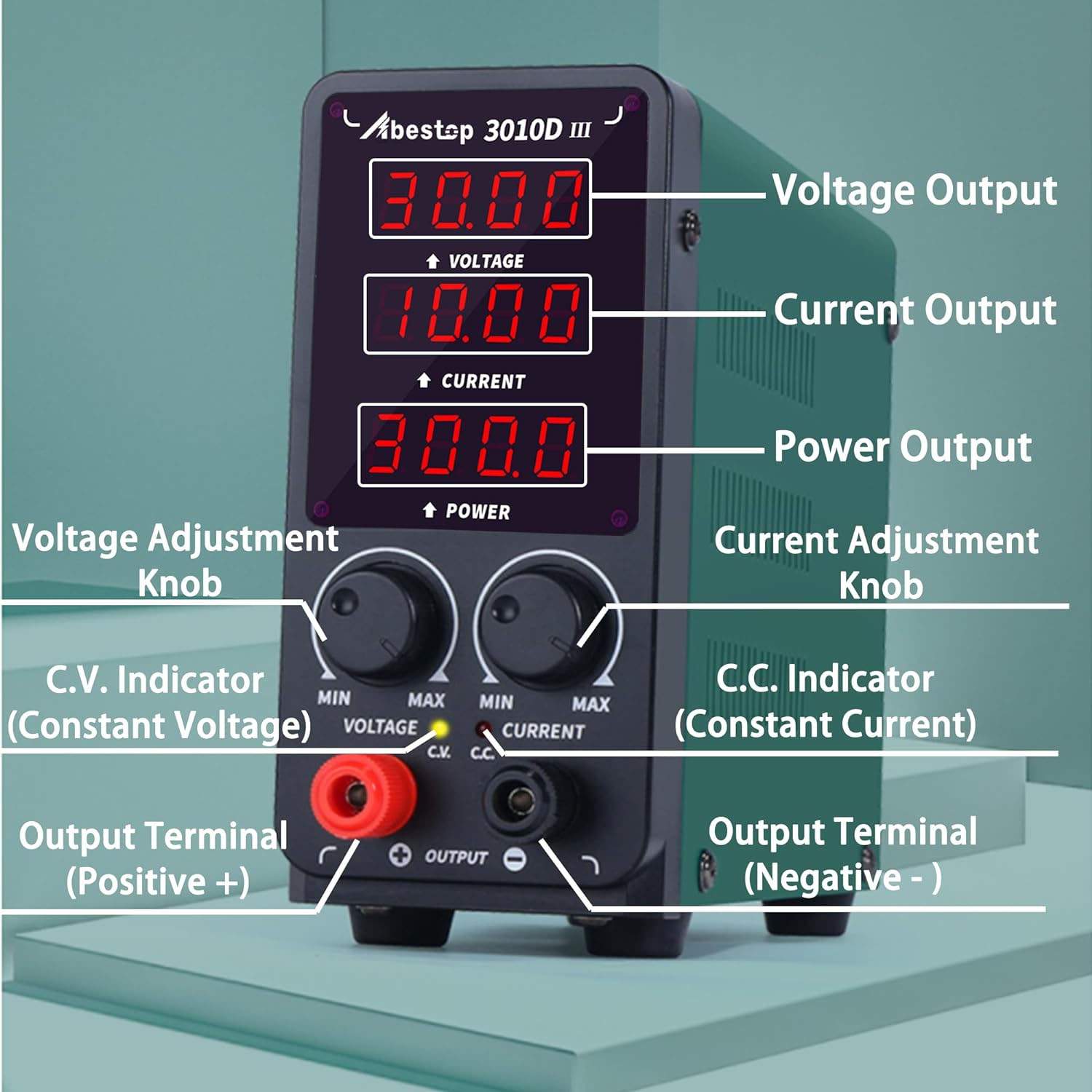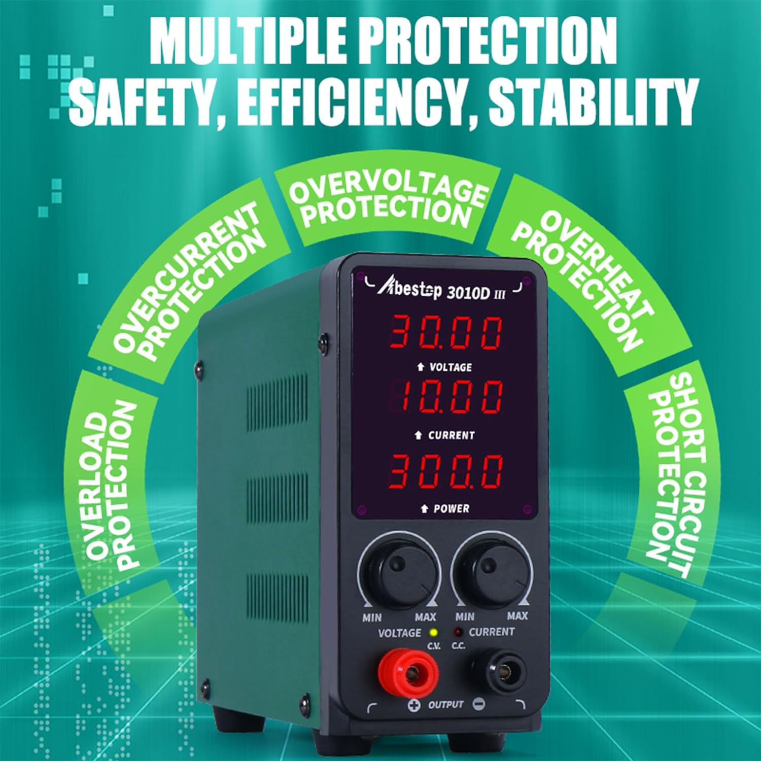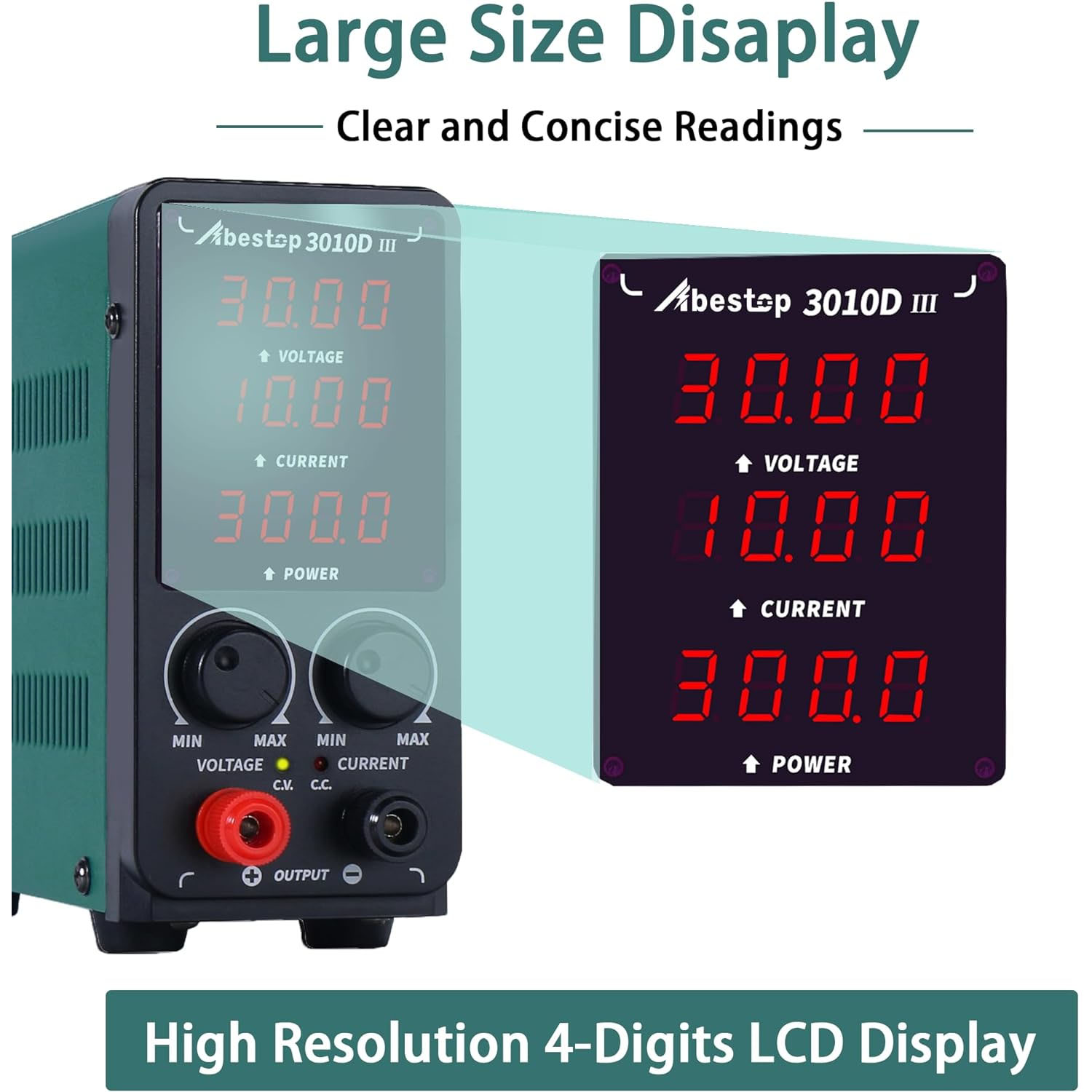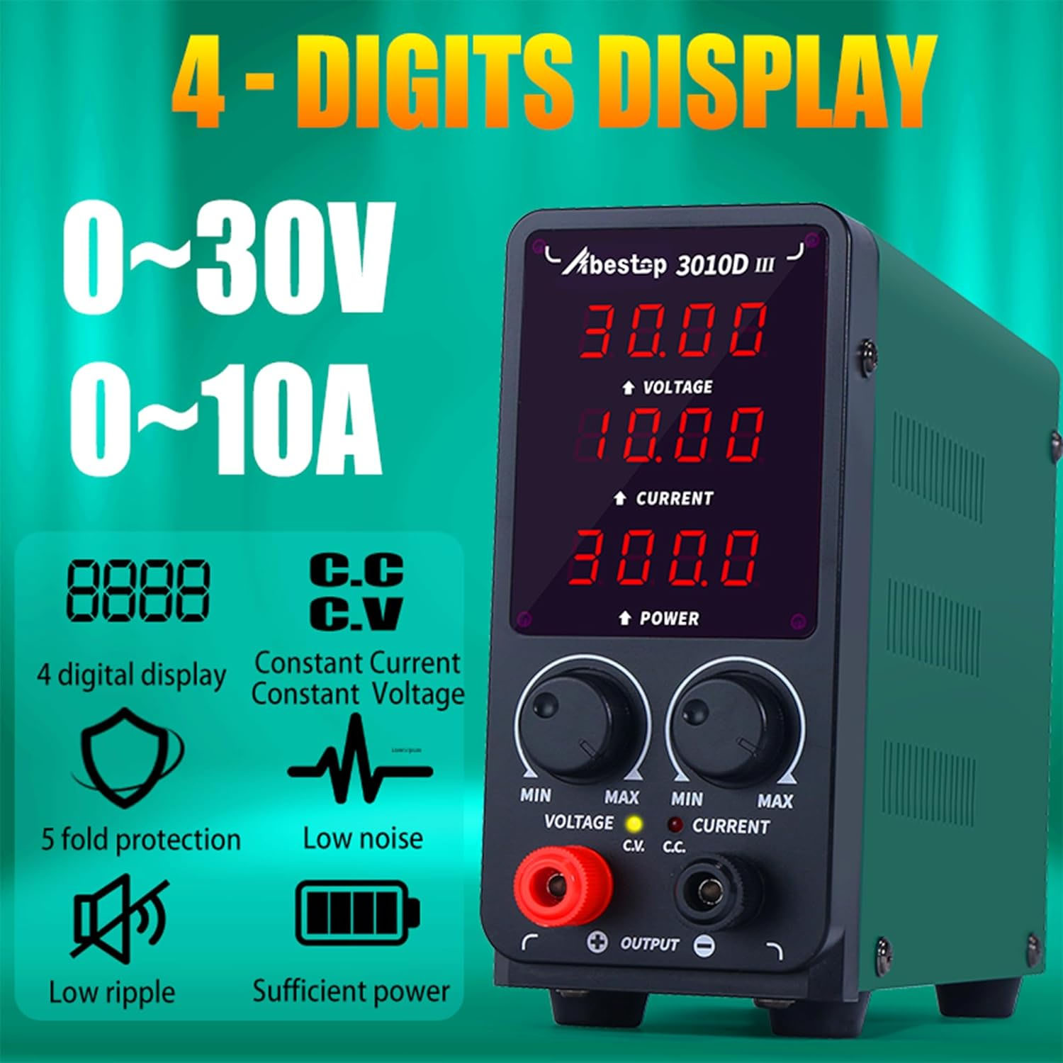 Η υποστήριξη οθόνης (LCD displays) 4 ψηφίων παρέχει πιο ακριβή και σαφή την τιμή τάσης και ρεύματος, μπορεί να διαβαστεί εύκολα σε περιβάλλον χαμηλού φωτισμού. Αυτό το τροφοδοτικό πάγκου είναι εξαιρετικά αποδοτικό με υψηλή χωρητικότητα ισχύος και σχετικά χαμηλό θόρυβο.
