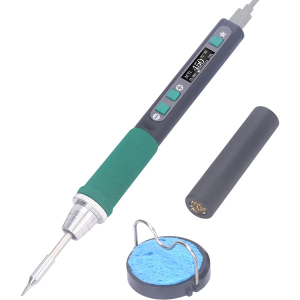 Μίνι επαγγελματικό κολλητήρι 20VDC 60W της με τροφοδοσία USB με ψηφιακές ενδείξεις, συνοδεύεται από τροφοδοτικό QC/PD (20VDC±10%) και καλώδιο USB-C για τη λειτουργία του. Με ρυθμιζόμενη θερμοκρασία έως 450°C, διαθέτει μια μύτη C235 ταχείας θέρμανσης (350°C σε 2sec). Διαθέτει ειδικό καθαριστικό μύτης, βάση στήριξης κολλητηριού και κασετίνα για εύκολη μεταφορά του.