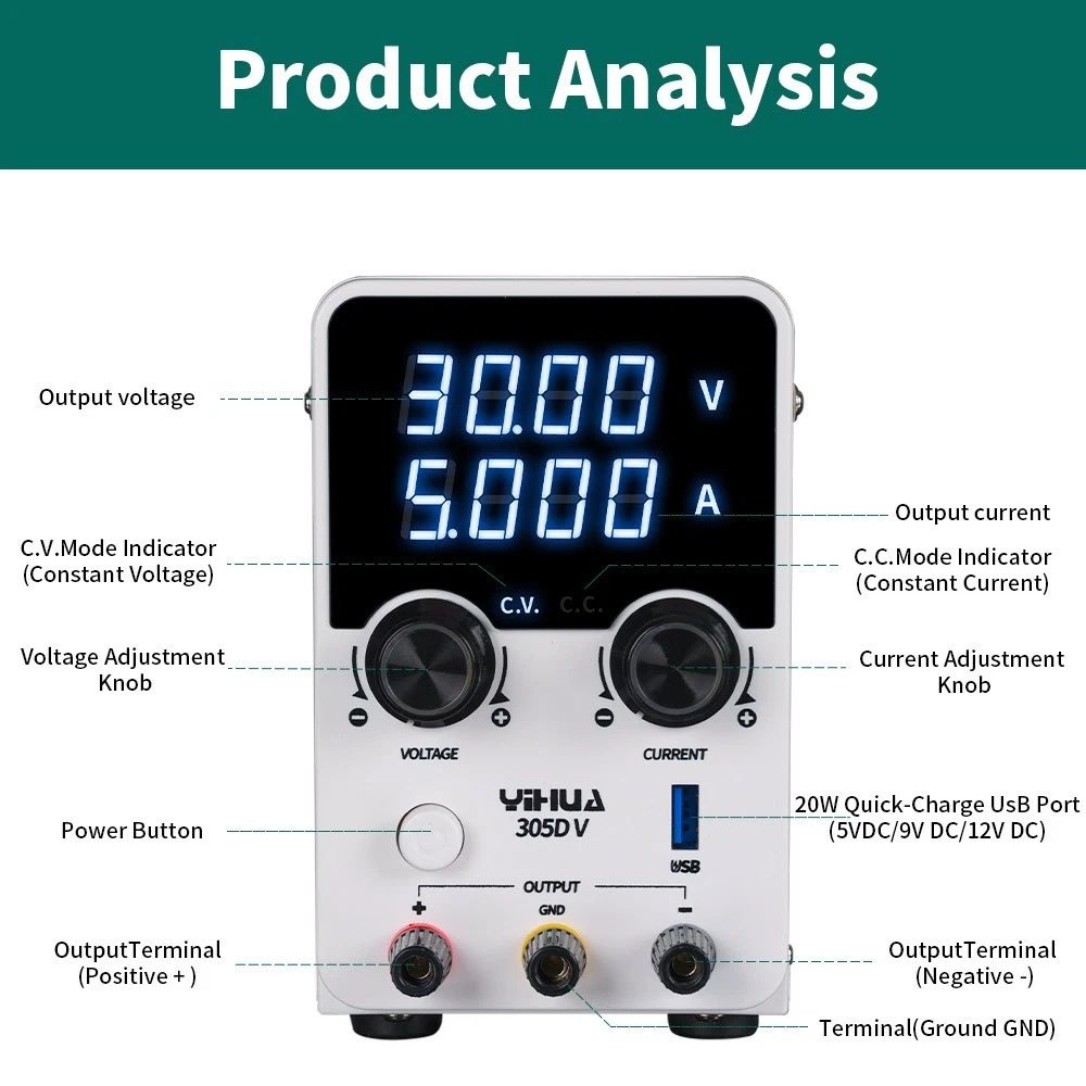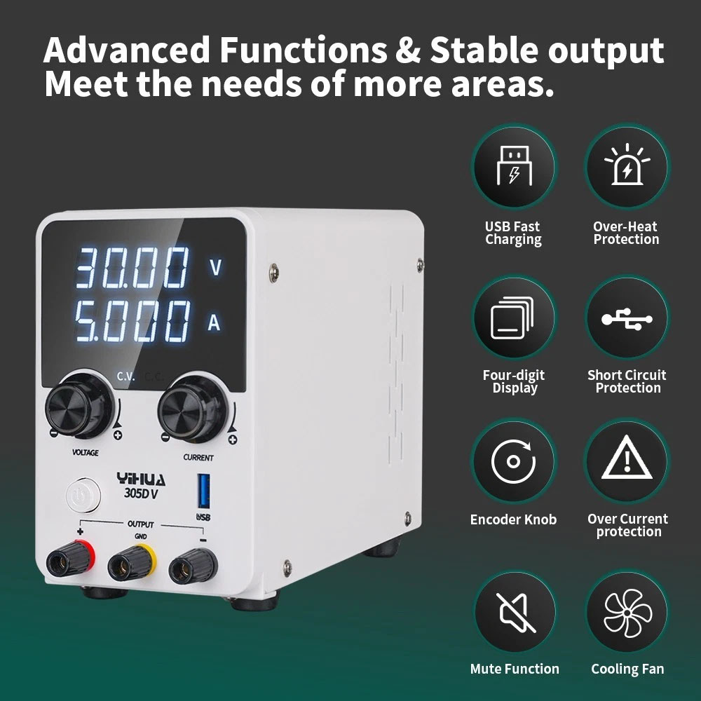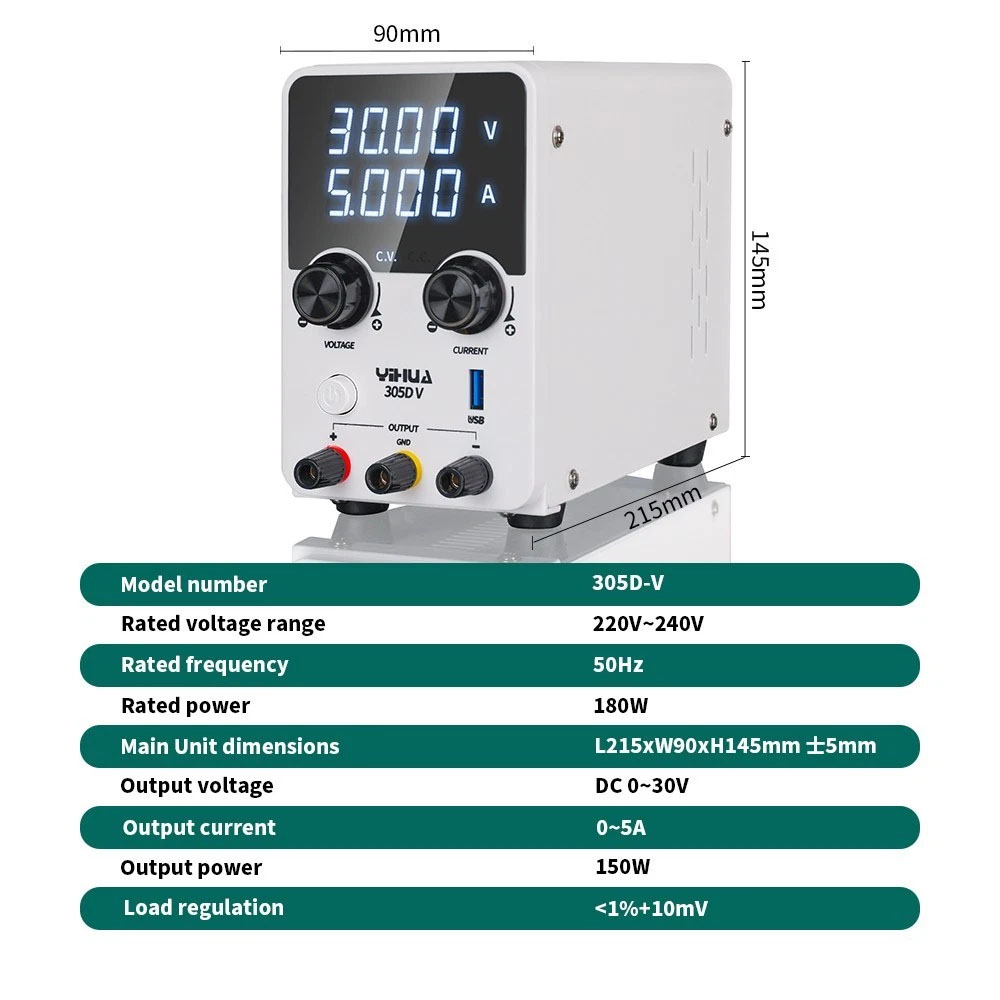 Το YIHUA 305D-V είναι ένα ρυθμιζόμενο τροφοδοτικό συνεχούς ρεύματος υψηλής ακρίβειας, σχεδιασμένο για αξιόπιστη και σταθερή λειτουργία σε επαγγελματικά και εκπαιδευτικά περιβάλλοντα. Αποτελεί ιδανική επιλογή για επιστημονική έρευνα, ανάπτυξη προϊόντων, εργαστήρια ηλεκτρονικών, σχολεία, γραμμές παραγωγής και επισκευές ηλεκτρονικών συσκευών.