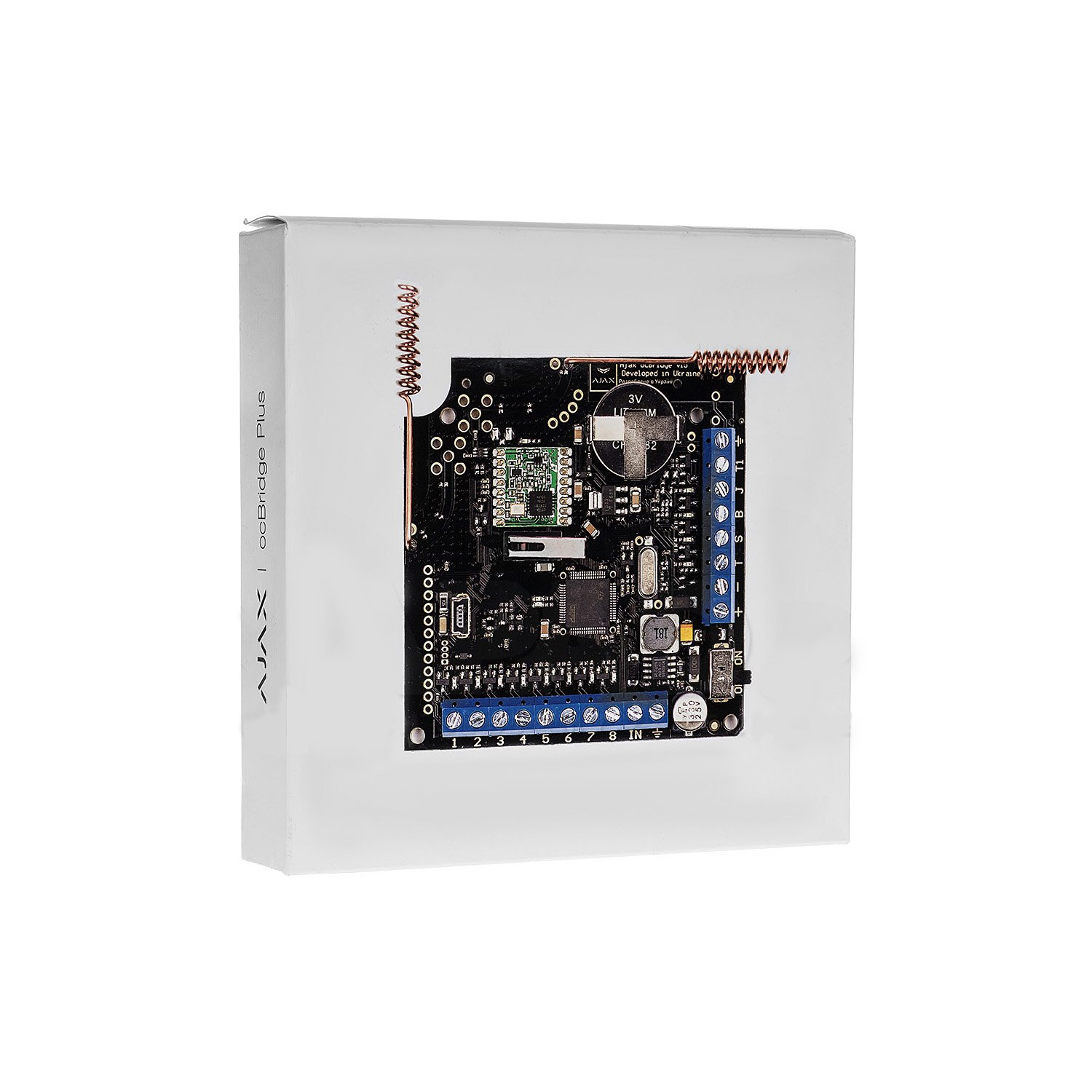 Το Ajax ocBridge Plus επιτρέπει την ενσωμάτωση των κορυφαίων ασύρματων ανιχνευτών της Ajax σε οποιοδήποτε υφιστάμενο ενσύρματο κέντρο συναγερμού. Λειτουργεί ως δέκτης που μετατρέπει τα ασύρματα σήματα σε ενσύρματες επαφές (Relays), υποστηρίζοντας έως και 99 ασύρματες συσκευές μοιρασμένες σε 8 ζώνες ασφαλείας.