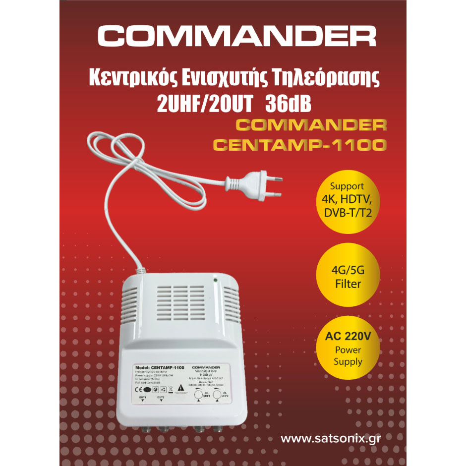 Ο COMMANDER CENTAMP-1100 είναι ένας ισχυρός κεντρικός ενισχυτής τηλεόρασης, ιδανικός για εγκαταστάσεις διανομής επίγειου ψηφιακού σήματος σε πολυκατοικίες και επαγγελματικούς χώρους. Διαθέτει 2 εισόδους UHF και 2 εξόδους, επιτρέποντας τη σύνδεση με splitters για διανομή σήματος σε πολλαπλά σημεία.
