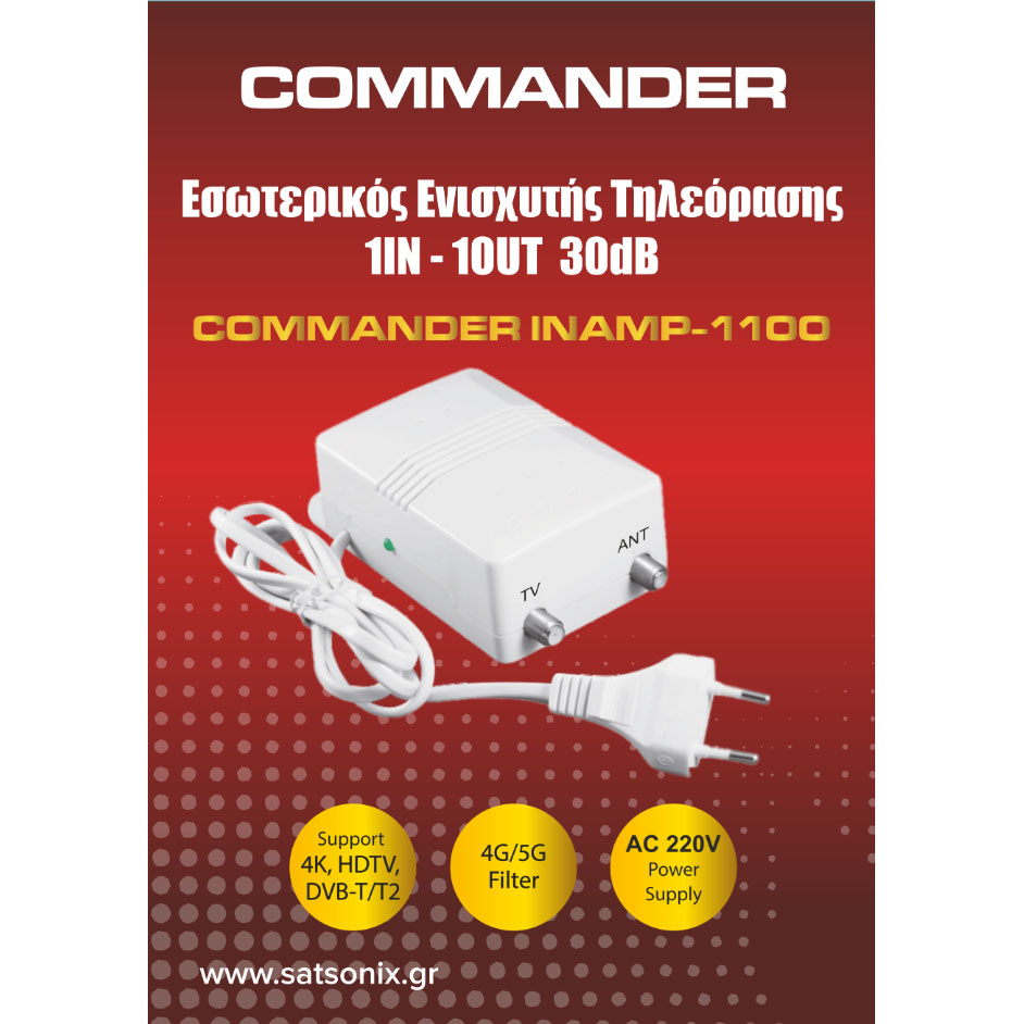 Ο COMMANDER INAMP-1100 είναι ένας ισχυρός εσωτερικός ενισχυτής τηλεόρασης, ιδανικός για ενίσχυση επίγειου ψηφιακού σήματος σε οικιακές εγκαταστάσεις. Διαθέτει 1 είσοδο και 1 έξοδο (1IN/1OUT), προσφέροντας εύκολη και άμεση σύνδεση.