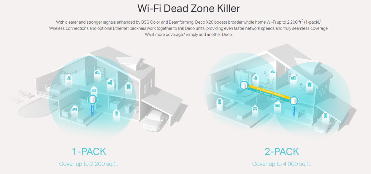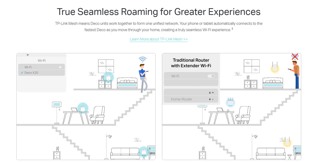 Η τεχνολογία Mesh Wi-Fi δημιουργεί ένα ενιαίο ασύρματο δίκτυο, επιτρέποντας στις δύο μονάδες να συνεργάζονται ώστε να εξαλείφουν τα νεκρά σημεία και να προσφέρουν συνεχή κάλυψη σε όλους τους χώρους. Με το Seamless Roaming, οι συσκευές συνδέονται αυτόματα στο ισχυρότερο σήμα χωρίς διακοπές, εξασφαλίζοντας αδιάλειπτη εμπειρία χρήσης καθώς μετακινείστε μέσα στο σπίτι.