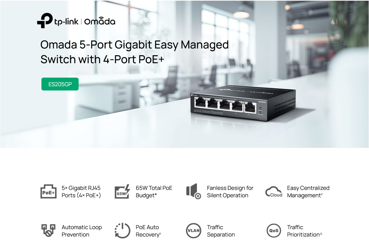 Το ES205GP είναι ένα προηγμένο Gigabit Smart Managed Switch, σχεδιασμένο για να καλύψει τις ανάγκες σύγχρονων δικτύων που απαιτούν ισχυρή τροφοδοσία PoE και κεντρική διαχείριση. Διαθέτει 4 θύρες Gigabit PoE+ με συνολική ισχύ 65W, καθώς και μία θύρα Gigabit RJ45 Uplink Port. Ως μέλος του οικοσυστήματος Omada, προσφέρει δυνατότητα διαχείρισης μέσω Cloud, ενώ η τεχνολογία Agile Config επιτρέπει στους παρόχους (ISPs) να προσαρμόζουν τις προεπιλεγμένες ρυθμίσεις μαζικά, μειώνοντας το κόστος υποστήριξης. Είναι κατάλληλο για την τροφοδοσία συσκευών Power Over Ethernet (τροφοδοσία πάνω στο καλώδιο δικτύου) που είναι σύμφωνες με το πρότυπο IEEE 802.3af/at., όπως IP κάμερες και IP phones και άλλα.