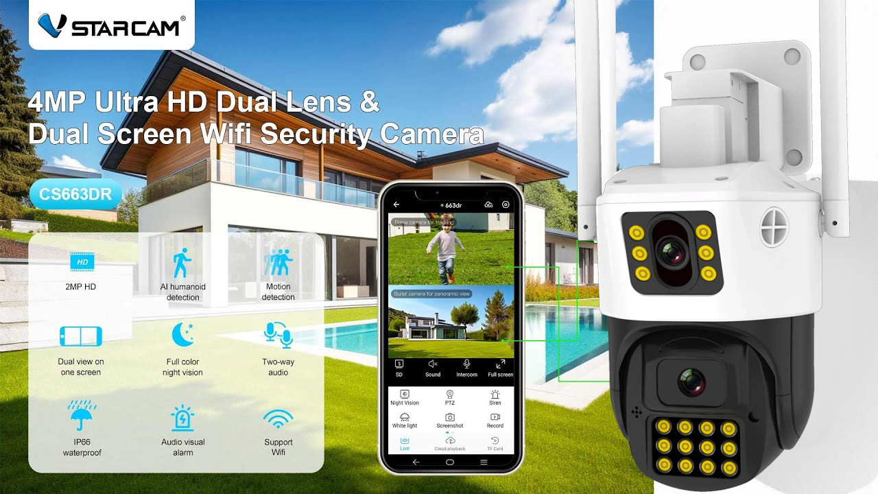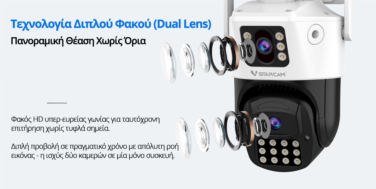 Η VStarcam CS663DR φέρνει την επανάσταση στην οικιακή και επαγγελματική ασφάλεια, εισάγοντας την τεχνολογία Dual Lens (Διπλού Φακού). Αντί για μια συμβατική κάμερα, η CS663DR διαθέτει δύο ανεξάρτητους φακούς, ανάλυσης 2MPixels Full HD 1080p o καθένας, που λειτουργούν ταυτόχρονα, επιτρέποντάς σας να παρακολουθείτε δύο διαφορετικά σημεία του χώρου σας μέσα από μία μόνο συσκευή. Είναι η ιδανική λύση για να καλύψετε "τυφλά" σημεία χωρίς το κόστος και τον κόπο εγκατάστασης δύο ξεχωριστών καμερών.